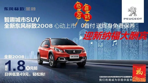1月13日常德雙星東風(fēng)標(biāo)致4S店舉行“全新標(biāo)致2008上市品鑒會(huì)暨0首付送終身免費(fèi)保養(yǎng),迎新納福大酬賓”活動(dòng)。全新標(biāo)致2008憑借高顏值、高性價(jià)比,上市以來好評(píng)如潮,全城熱議。