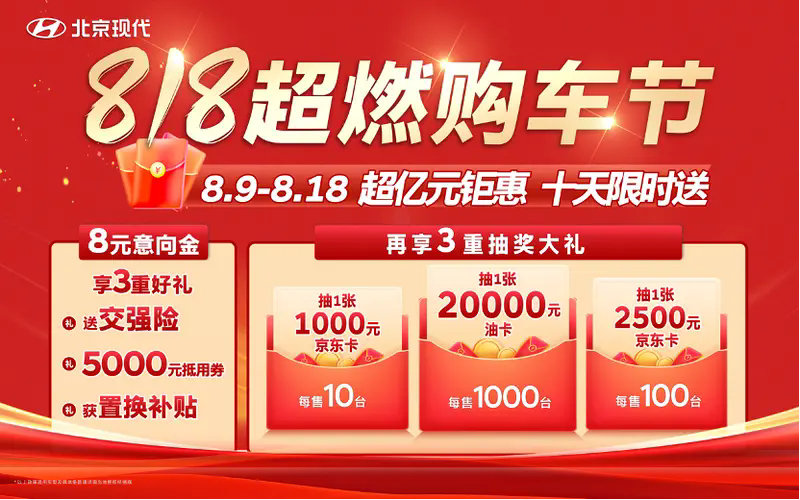 北京現(xiàn)代啟動“818·超燃購車節(jié)”,以8元意向金為入口,疊加三重購車禮(交強(qiáng)險(xiǎn)、5000元購車抵用券、置換補(bǔ)貼)及階梯抽獎。